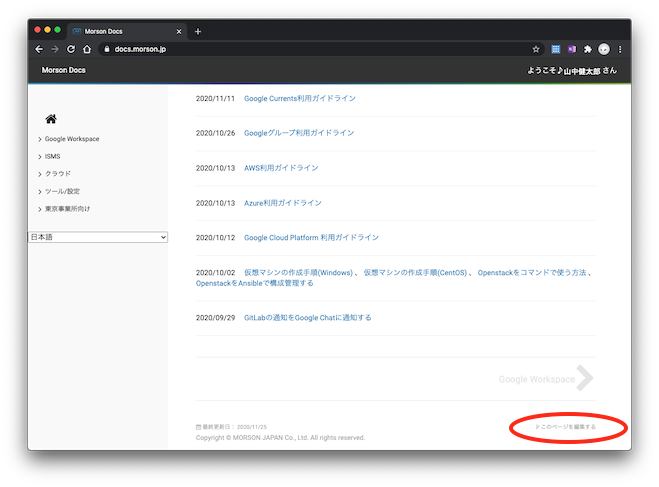 Morson Docsの編集したいページの画面下で「このページを編集する」をクリックします。