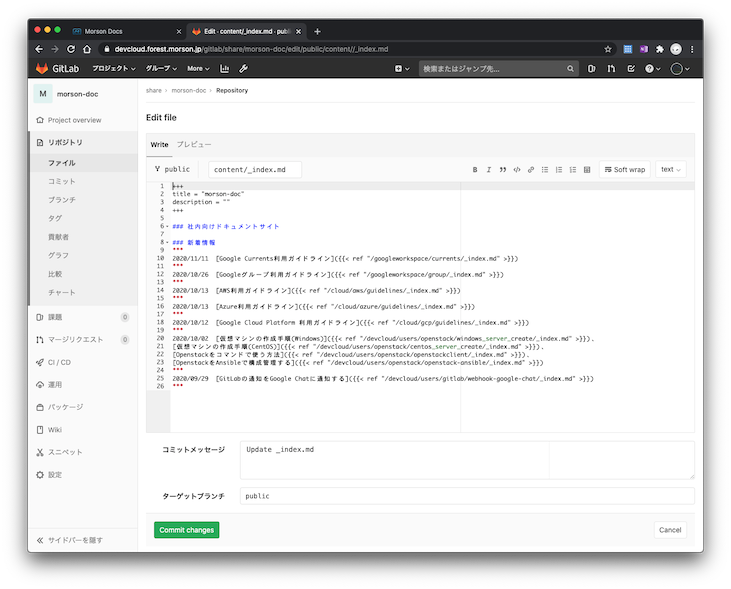 GitLabの編集画面に移動しますので、そちらで編集してコミットしてください。
