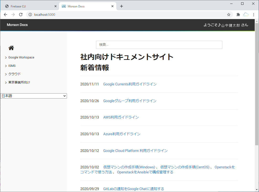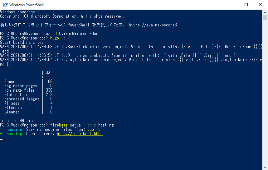 hugoでビルドし、firebaseでローカルにホスティングします。