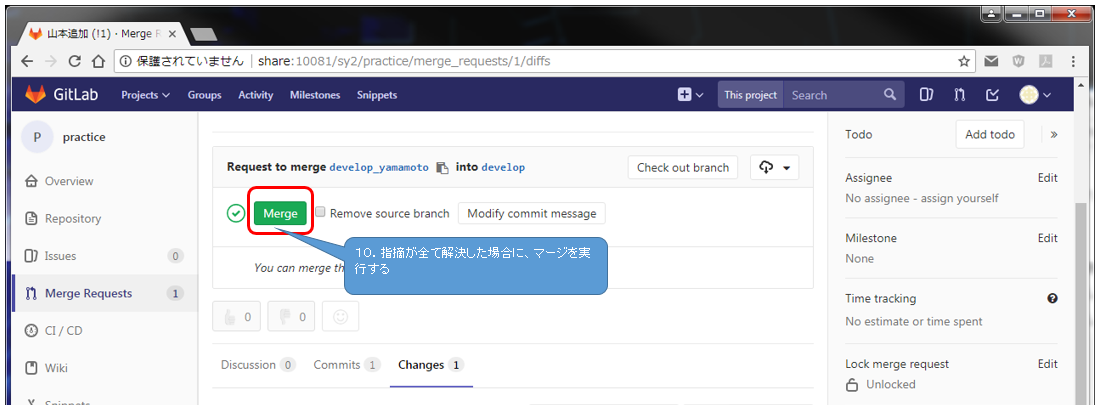 - 指摘がある場合は、この状態でMerge Requestを行った人に連絡する