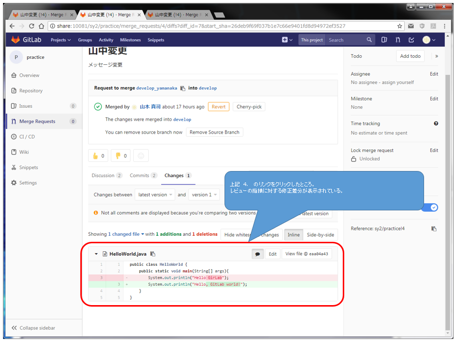 - 再度Merge Requestを開いて、指摘内容に対するコメントを記入する