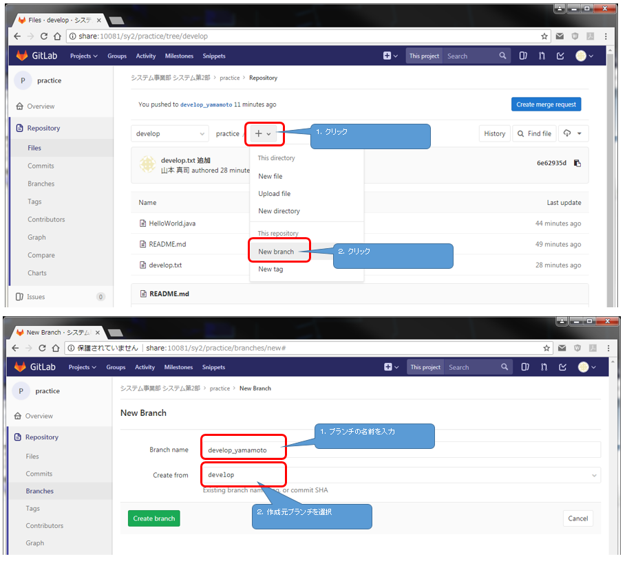 - 開発環境で、作業用ブランチをチェックアウトする
