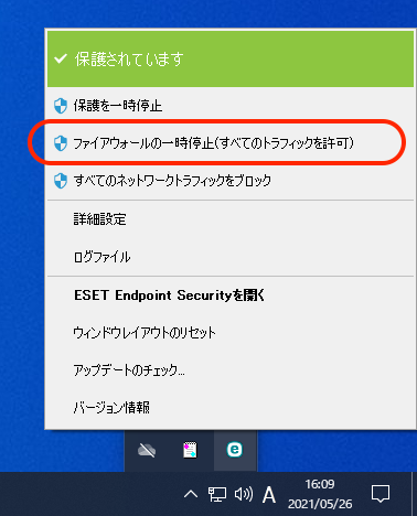 以下の画像のようにタスクバーにあるESETのアイコンで右クリックすると、一時的にESETを無効化できます。