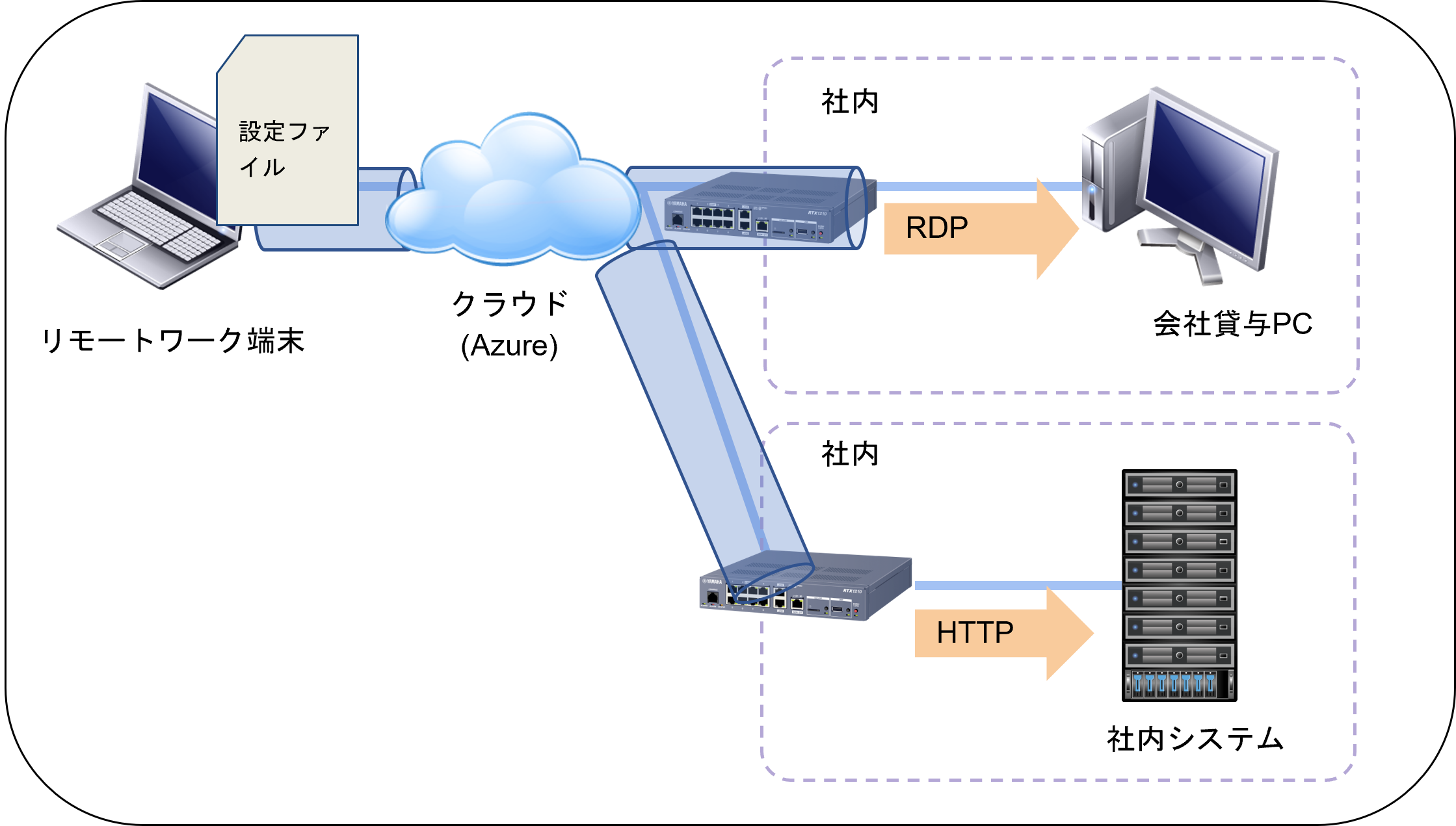 リモートワーク端末から、Azure(マイクロソフトのクラウド)を経由して、